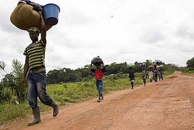 Vor allem Binnenvertriebene ziehen mit allem, was sie tragen oder auf kleinen Handwägen oder Karren unterbringen können, in ihrem eigenen Land in sichere Regionen.