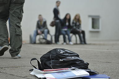 Rucksack liegt ausgekippt auf dem Boden, im Hintergrund sitzt eine Gruppe Jugendlicher.