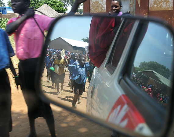 Vor dem Tor drängeln sich schreiende und winkende Kinder um ein Auto. Sie verabschieden drei ehemalige Kindersoldaten.