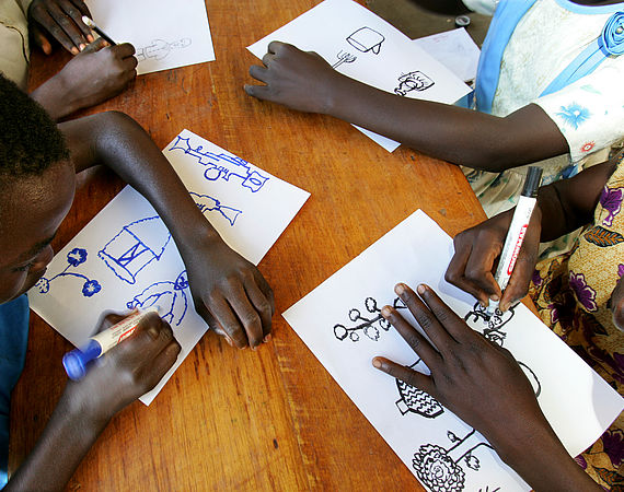 Viele Kinder im Lager haben Alpträume und Schuldgefühle. Sie malen ihre Erlebnisse: brennende Häuser, Gewehre und Gefangene. Und dann sprechen sie darüber.