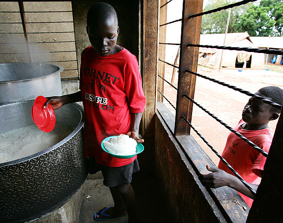 Jeden Tag wird gemeinsam gekocht, gespült, gebetet. Jeder hat eine feste Aufgabe. Hier müssen die Kinder nachholen, was sie bei den Soldaten verlernt haben.