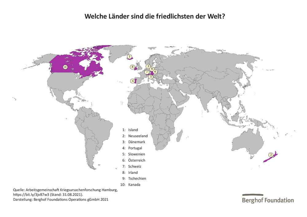 Schon seit 1849 kommt Island ganz ohne Armee aus. Auch Costa Rica, das sich beim Weltfriedensindex auf Platz 39 befindet, schaffte vor fast 70 Jahren das Militär ab. Seither gab es in Costa Rica keine Bürgerkriege und die Demokratie ist stabil. Die Niederlande landete 2023 auf Platz 21 des Weltfriedensindexes. Hier ist die Kriminalitätsrate so niedrig, dass manche Gefängnisse leer stehen. Einen Teil davon hat die niederländische Regierung an Norwegen und Belgien vermietet, die dort ihre Häftlinge unterbringen. Manche Menschen in den Niederlanden wohnen aber auch ganz freiwillig „hinter Gittern“. Die restlichen leeren Gefängnisse wurden nämlich zum Beispiel in Privatwohnungen, Hotels oder Flüchtlingsunterkünfte umgebaut.3Quelle: Institute for Economics and Peace, Global Peace Index 2023 (Stand: 23. August 2023), visionofhumanity.org/indexes/global-peace-index/