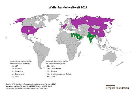 Knapp ¾ der Waffen werden von nur 5 Ländern hergestellt und verkauft. Diese Länder befinden sich alle in der nördlichen Hälfte der Erdkugel. Indien ist das Land, das den größten Anteil an Waffen kauft, gefolgt von Saudi-Arabien, Katar, Australien und China.