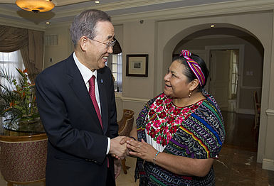 Rigoberta Menchú Tum trifft UN-Generalsekretär Ban Ki Moon.